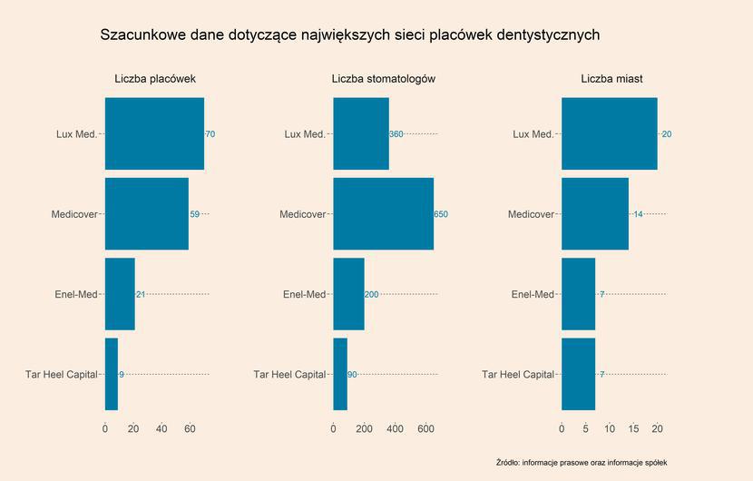 W ostatnich latach rynek intensywnie konsolidują trzej duzi gracze branżowi: Lux Med, Medicover i Enel Med. Do tego grona w połowie 2020 r. dołączył fundusz private equity Tar Heel Capital. Pod względem liczby placówek rynkowym liderem jest Lux Med, a pod względem liczby stomatologów Medicover. Czterej najwięksi gracze odpowiadają jednak za mniej niż 10 proc. całego rynku stomatologicznego w Polsce.