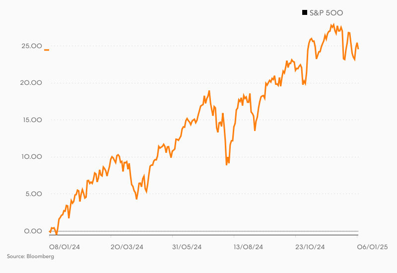 - W 2024 r. S&P 500 wzrósł o 23,3 proc., więcej niż wielu oczekiwało. Przed ponad rokiem liczni analitycy znanych banków z Wall Street spodziewali się spadku indeksu, a żaden nie prognozował jego wzrostu powyżej 6000 pkt. JP Morgan prognozował 4200 pkt na koniec 2024 r., Morgan Stanley 4500, Citi i Goldman 5100, a Capital Economics 5500. Na początku grudnia, kiedy wiadomo było, że te prognozy są przestrzelone, niemal wszyscy postawili na kontynuację trendu w 2025 r. Średnia z prognoz 23 analityków zakładała wzrost do 6539 pkt, a czterej eksperci kurs docelowy oszacowali na 7000 i więcej pkt. Tylko jeden założył, że indeks zakończy ten rok spadkiem. Andrew McElroy uważa, że taki zwrot to jak syrena alarmowa, bo uczestnicy rynku szybko pozycjonują się pod oczekiwane zyski. Widać to choćby na wykresach odzwierciedlających alokację profesjonalnych zarządzających w akcjach czy pokazujących odsetek aktywów osób prywatnych i organizacji non-profit ulokowany w akcjach (w obu wypadkach rekordowy).