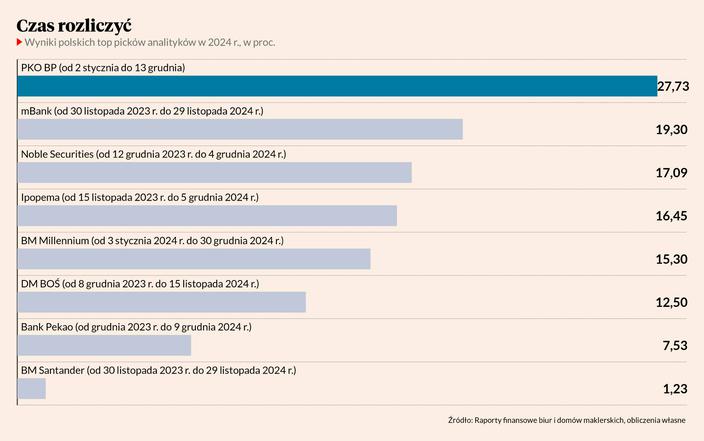Muszę tu zrobić dwa zastrzeżenia. Po pierwsze, w kalkulacjach stopy zwrotu uwzględniłem tylko spółki notowane na GPW, aby ocenić instynkt analityków do rodzimego rynku. Po drugie, każdy portfel miał inny okres funkcjonowania. Przykładowo, analitycy Ipopema Securities podali stopy zwrotu rekomendowanych spółek od 15 listopada 2023 r. do 5 grudnia 2024, a zespół z PKO BP - od 2 stycznia do 13 grudnia 2024. Jest to istotne, ponieważ w każdym z tych okresów stopa zwrotu WIG, traktowana jako benchmark, była inna, co wpływa na średni wynik relatywny (różnica między stopą zwrotu portfela a stopą zwrotu WIG) całego portfela. W przypadku PKO BP porównywalny indeks WIG wzrósł o 4 proc., ale w przypadku Ipopemy aż o 16,3 proc.