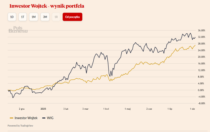 Ogłoszenie projektu osobistych kont inwestycyjnych przez ministra finansów Andrzeja Domańskiego przykuło moją uwagę w ostatnich dniach, ale chciałbym wrócić do wyników portfela w ostatnim miesiącu. Dla WIG, czyli najszerszego indeksu warszawskiej giełdy, był to ósmy z rzędu miesiąc zakończony zwyżką. Moja dobra passa trwa nawet dłużej, bo dziewięć miesięcy - czyli każdy z miesięcy, w których byłem aktywny na rynku kapitałowym, zakończyłem na plusie. Przez trzy ostatnie miesiące moje wyniki są wyraźnie lepsze od WIG - portfel urósł prawie o 13 proc., a indeks o 5,8 proc. Wcześniej było jednak odwrotnie (na dodatek długo moje zaangażowanie w akcje było poniżej 50 proc., więc nie korzystałem z hossy tak, jak mogłem), dlatego licząc od listopada 2024 r. (czyli upublicznienia portfela), wciąż zarobiłem trochę mniej, niż wyniosła zmiana WIG (27 wobec 32 proc.).