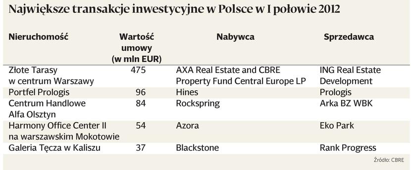 Największą umową w tym okresie, w całym regionie Europy Środkowej i Wschodniej, była sprzedaż przez ING Real Estate Development kompleksu handlowo-biurowego Złote Tarasy w Warszawie. Ich nabywcą został fundusz, którego właścicielem jest Unibail Rodamco, a zarządcami AXA Real Estate oraz CBRE PFCE. W 2012 r. swój udział w wartości transakcji na rynku nieruchomości zwiększy z pewnością sektor magazynowy. Już w pierwszym półroczu spółka ProLogis sprzedała swój portfel firmie Hines za 96 mln EUR.
