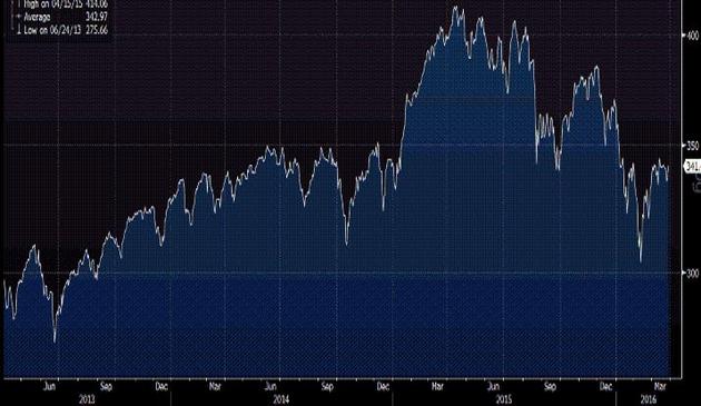 Notowania indeksu Euro Stoxx 600 w ciągu ostatnich trzech lat. Źródło: Bloomberg.