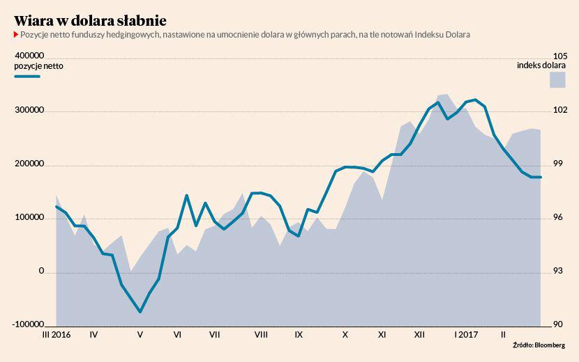 W miarę zbliżania się zaplanowanego na wtorkowy wieczór przemówienia Donalda Trumpa przed połączonymi izbami kongresu traderzy liczyli, że odsłoni ono szczegóły programów stymulacyjnych nowej administracji, pozwalając na wznowienie umocnienia dolara. Jednak wycofywanie się profesjonalnych zarządzających z pozycjonowania nastawionego na zwyżki dolara pokazuje, że najbardziej wyrafinowani gracze tracą wiarę w realizację takiego scenariusza. Dolarowi nie pomogła także wtorkowa rewizja danych o PKB za czwarty kwartał, co skutkowało zmniejszeniem szacowanego przez inwestorów prawdopodobieństwa marcowej podwyżki stóp Fedu do poniżej 50 proc.
