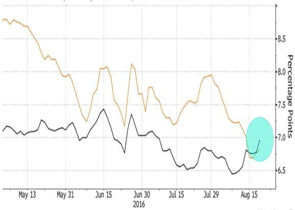 Dodatkowy koszt, jaki za finansowanie płaci rząd w Kijowie (linia czarna) oraz rząd w Bagdadzie (linia żółta), od początku maja, w punktach procentowych. Źródło: Bloomberg.