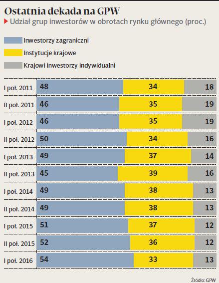 W pierwszym półroczu 2016 r. inwestorzy zagraniczni wygenerowali 54 proc. obrotu akcjami na głównym parkiecie Giełdy Papierów Wartościowych. To 2 pkt. proc więcej niż w drugim półroczu 2015 r. i 3 pkt. proc. więcej niż w pierwszym półroczu 2015 r., kiedy po raz pierwszy w historii przekroczyli 50-procentowy udział w obrotach (GPW podaje takie dane co pół roku). Równe 50 proc. osiągnęli jeszcze w końcu 2012 r., choć największą grupą inwestorów rynku przy ul. Książęcej są w zasadzie od pęknięcia banki na rynku nieruchomości, kiedy to ich udział w obrotach przekroczył 40 proc. Równocześnie ze wzrostem znaczenia zagranicznych funduszymaleje znaczenie polskich oraz inwestorów indywidualnych. W pierwszym półroczu 2016 r. udział w obrotach TFI i OFE spadł do 33 proc. Ostatnio taki poziom był notowany na początku 2010 r., a poprzednio w latach 2004- -05. Inwestorzy indywidualni odpowiadają obecnie za 13 proc. obrotów rynku głównego. To 1 pkt proc. więcej niż w całym 2015 r. i tyle samo co w 2014 r. Inwestorzy detaliczni zdecydowanie dominują na NewConnect. Trzy czwarte handlu to ich sprawka. Ale warto pamiętać, że dzienne obroty na rynku głównym są około ośmiu razy większe od miesięcznych na NewConnect. Mimo to na NewConnect obecni są również inwestorzy zagraniczni. Od stycznia do czerwca 2016 r. wygenerowali tam 8 proc. obrotu. Kolejne 17 proc. przypadło na krajowe fundusze. © Ⓟ