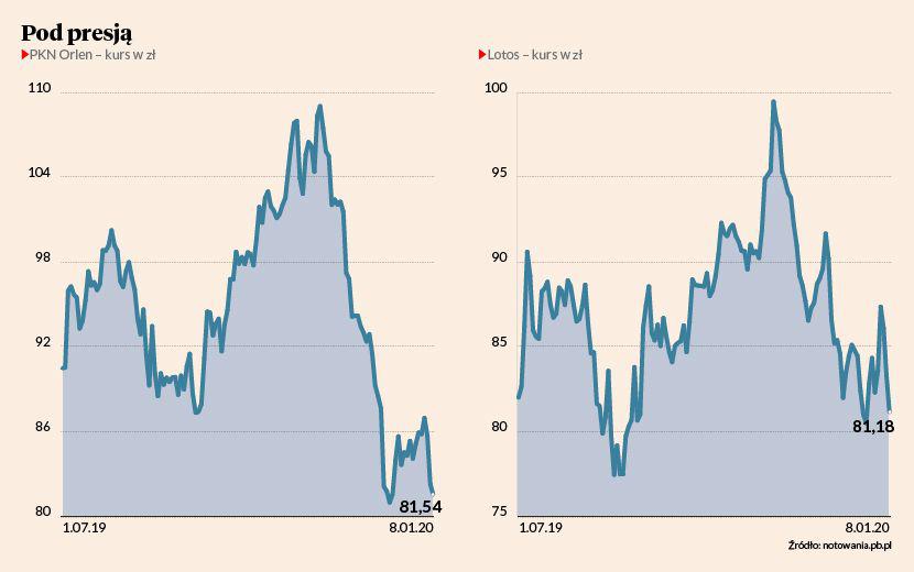 Końcówka 2019 r. nie była udana dla dwójki polskich gigantów branży paliwowej notowanych na GPW. Ich akcje w listopadzie i grudniu wyraźnie traciły, a WIG-Paliwa ostatecznie okazał się najsłabszym indeksem branżowym na giełdzie w ubiegłym roku. Nic dziwnego, bo raporty analityczne dotyczące sektora sugerowały, że rok 2020 będzie dla Orlenu i Lotosu trudniejszy niż poprzedni. Do tego doszły m.in. spadki marż notowane przez Orlen, który dodatkowo zaangażował się w przejęcie Energi. Rok 2020 nie zaczął się lepiej.