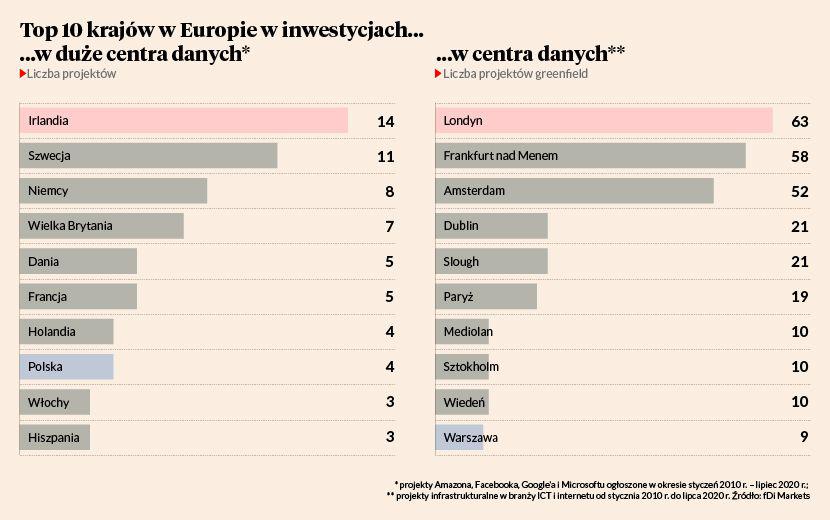 W rankingu miast, w których powstaje najwięcej centrów danych (wszystkich firm), Dublin jest co prawda dopiero czwarty, ale Londyn jest pierwszy, a również brytyjskie Slough piąte. Czwórka amerykańskich gigantów wybrała jednak Irlandię, w której ma też europejskie siedziby. Najwięcej projektów w Europie w ostatniej dekadzie ogłosił Amazon — 29 nowych inwestycji w infrastrukturę ICT i internet. Microsoft zapowiedział 23, Google 15, a Facebook sześć. Google ogłosił w czerwcu, że zainwestuje 2 mld USD w nowy region chmury w Warszawie. Podobny projekt zapowiedział w maju we Francji. Również w maju Microsoft poinformował, że wyda w Mediolanie 1,5 mld USD. W Polsce firma zbuduje nowe centrum danych za 1 mld USD.