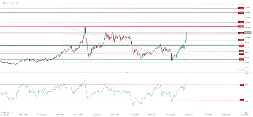 Jeszcze w zeszłym roku poziom 100 dolarów za baryłkę wydawał się raczej abstrakcyjnym scenariuszem. Nawet w tym roku niewiele osób widziało poziom 120 dolarów dla ropy Brent w przypadku pełnej inwazji Rosji w Ukrainie. Wszystkie mało realne scenariusze stały się faktem, a ceny poszybowały jeszcze dalej niż początkowe scenariusze. Wciąż jednak ceny nie osiągnęły historycznych maksimów, jak jest to w przypadku innych cen surowców w które również mocno zaangażowana jest Rosja. Gdzie możemy szukać szczytów na ropie?
