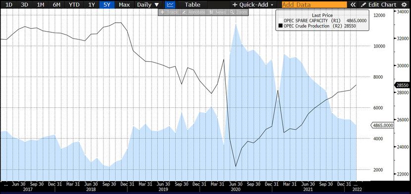 Wolne mocne produkcyjne w OPEC to ok. 5 mln brk na dzień, ale realnie połowa z tego może być wykorzystana. Źródło: Bloomberg