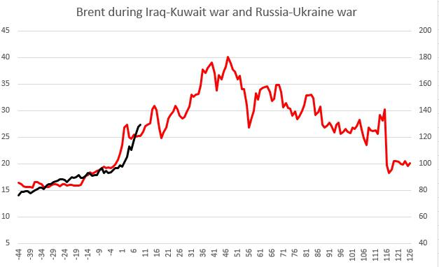 Kiedy Irak zaatakował Kuwejt, ilość ropy, która została „zamrożona” to ok. 4,5 mln brk na dzień, czyli 7-8% ówczesnej podaży (USA nałożyły embargo na iracką ropę). Teoretycznie obecna sytuacja jest bardzo podobna, choć realnie ilość zagrożonej ropy jest mniejsza, ale skoncentrowana na Europie. Ceny wzrosły wtedy w krótkim okresie nawet o 140%, ale w perspektywie mniej niż 1 roku spadły do podobnych poziomów jak przed wojną.