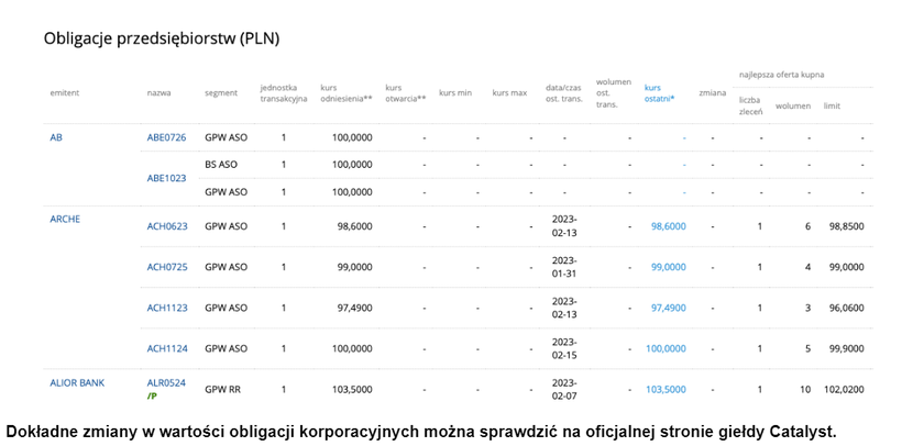 Dokładne zmiany w wartości obligacji korporacyjnych można sprawdzić na oficjalnej stronie giełdy Catalyst.