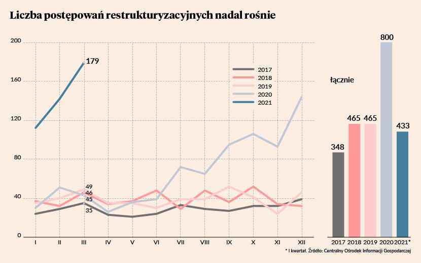 Jednym z celów przyświecających ustawodawcy przy wprowadzaniu covidowego trybu restrukturyzacji było przyspieszenie procesu i odciążenie sądów. W 2020 r. otwarto 800 postępowań restrukturyzacyjnych, o 84 proc. więcej niż w 2019 r., wówczas było ich 435 — wynika z analiz Centralnego Ośrodka Informacji Gospodarczej.