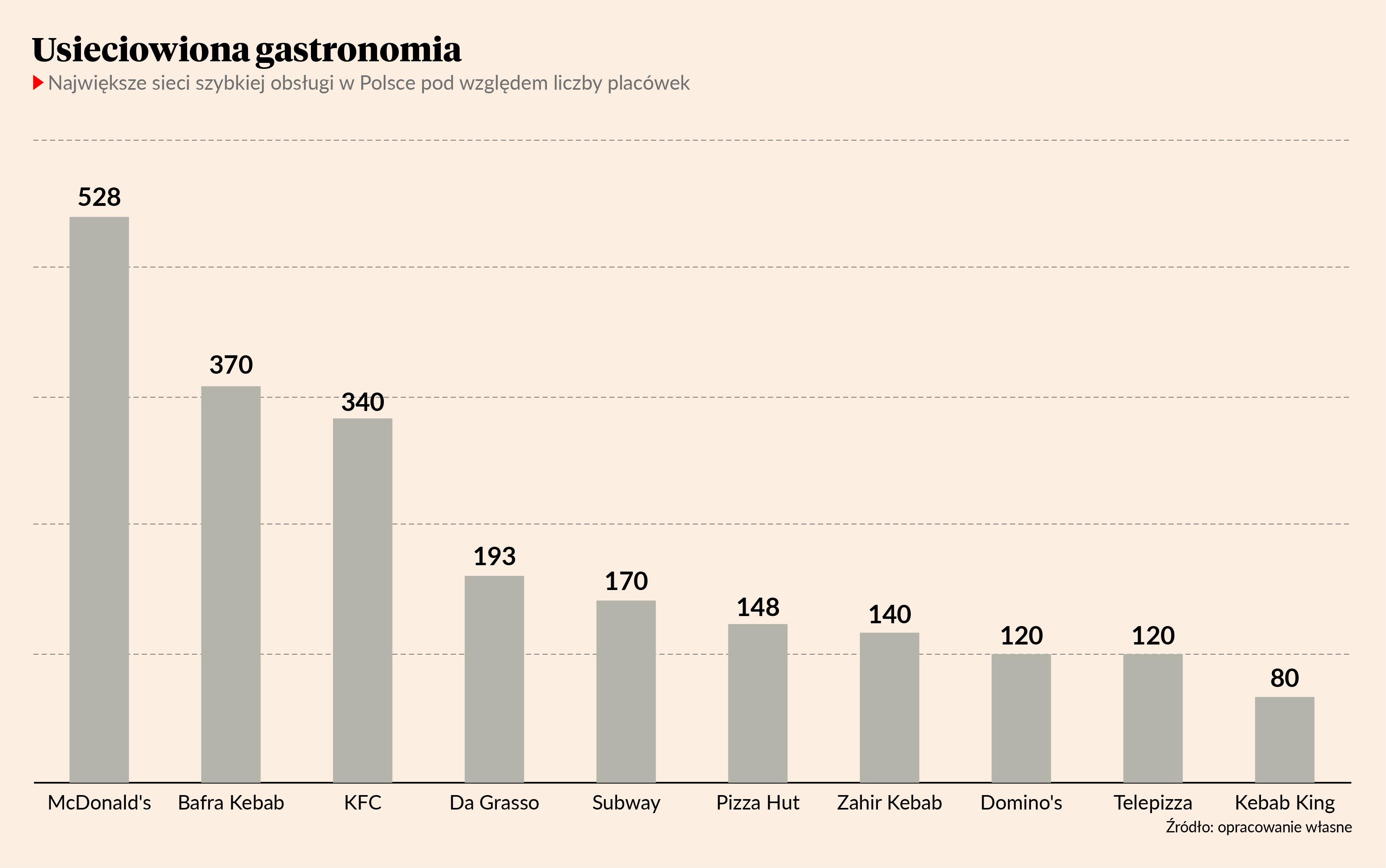 Branża jest bardzo zróżnicowana i trudna do zmierzenia. Gros obrotów to pojedyncze placówki gastronomiczne. W segmencie sieciowym najsilniejsze są wywodzące się z USA fastfoody, które jako jedyne na rynku mogą liczyć obroty w miliardach złotych. Wyraźnie za nimi - zarówno pod względem liczby placówek, jak i obrotów - są sieci w segmencie fast casual, czyli przede wszystkim pizzerie, a także restauracje takie jak giełdowy Sphinx. W segmencie kebabów, w którym dzięki sprzedaży w małych punktach szybko umacnia się Bafra, zbudowano kilka dużych, choć niekoniecznie porównywalnych sieci. Mający kurdyjskie korzenie Kebab King stawia na spore lokale stacjonarne. Podobną strategię ma Zahir Kebab założony przez pochodzącego z Bangladeszu Zahira Islama, który niespełna dekadę temu zaczynał od jednego lokalu w Ostrowie Wielkopolskim, a teraz ma ok. 140.