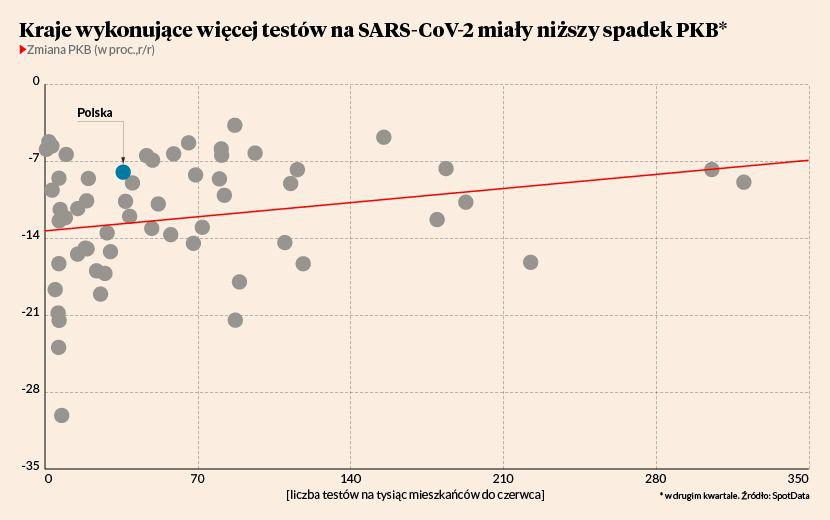 Ze statystyk wynika, że kraje wykonujące dużą liczbę testów zanotowały w drugim kwartale średnio mniejszy spadek PKB od wykonujących mało — mimo że generalnie w pierwszej grupie są kraje mocniej dotknięte epidemią. Dlaczego duża liczba testów pomaga? Bo pozwala szybko wyłapywać osoby zainfekowane i wysyłać je na kwarantannę lub wprowadzać lokane obostrzenia, jak robiono w Chinach, Korei czy Singapurze, które nieźle poradziły sobie z epidemią. Restrykcje są dotkliwe dla lokalnych społeczności, ale pozwalają gospodarce jako całości funkcjonować w miarę normalnie.