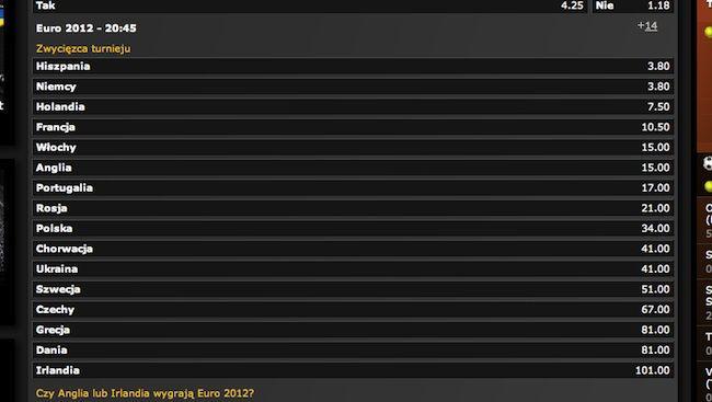 Na początek żadna nowość. Faworytem całego EURO 2012 u bukmacherów jest Hiszpania. Przykładowo, w Unibet wygrana Hiszpanów warta jest 3,75, nieznacznie gorzej są oceniane szanse Niemców (3,85), dalej Holendrów (7,50).