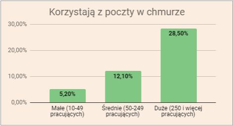 Na podobnym poziomie utrzymuje się również popularność korzystania z poczty e-mail w chmurze. Tutaj podobnie wysyłanie dużych plików może mieć w przypadku wolnego łącza istotny wpływ na osłabienie jakości działania usługi.