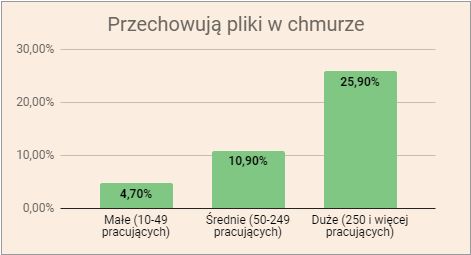 Dla wielu polskich firm praca w chmurze jest codziennością – potrzebna jest im wysoka prędkość pobierania i wysyłania danych. Do czego polskie firmy używają chmury? Między innymi do przechowywania plików. Korzysta z niej 25,9 proc. firm zatrudniających minimum 250 pracowników. Generalnie – to właśnie w dużych firmach korzystanie z chmury cieszy się największym zainteresowaniem.