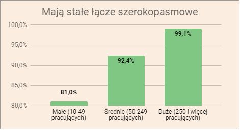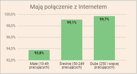 W przypadku małych firm blisko 94 proc. ma dostęp do internetu, a jeśli chodzi o średnie i duże firmy, to wynik ten przekracza 99 proc.! Jeśli chodzi o technologię dostępu do internetu, to 81 proc. małych firm korzysta z łącza szerokopasmowego (DSL, ADSL, SDSL, VDSL, sieci telewizji kablowej, sieci światłowodowej). W przypadku średnich firm wynik ten wynosi 92,4 proc., a dużych – 99,1 proc. Rezultaty obrazuje poniższy wykres: