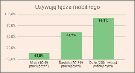 Na kolejnym wykresie prezentujemy, jaki procent firm korzysta z internetu mobilnego w technologii 3G lub 4G. Zauważalne jest to, że w zdecydowanej większości firm wykorzystywany jest zarówno internet szerokopasmowy, jak i internet mobilny, lecz w przypadku internetu mobilnego odsetek firm jest mniejszy. Korzysta niego 65,8 proc. małych firm, 84,2 proc. średnich i 96,9 proc. dużych.