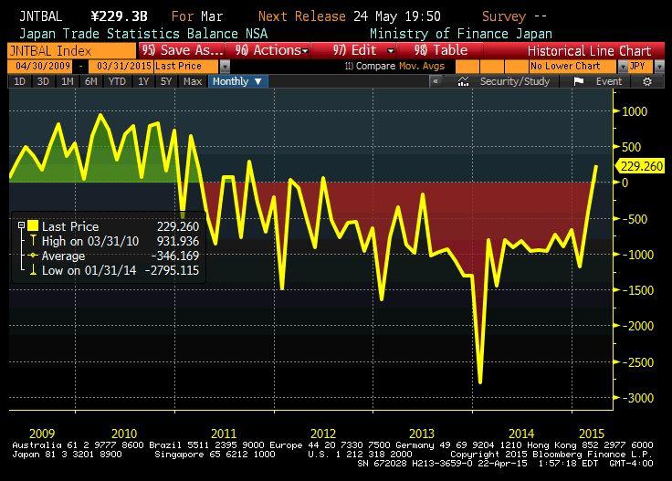 Nadwyżka handlowa w marcu zamknęła się kwotą 229,3 mld jenów (1,9 mld USD) i ponad czterokrotnie była wyższa od wyniku oczekiwanego przez specjalistów (50 mld jenów).