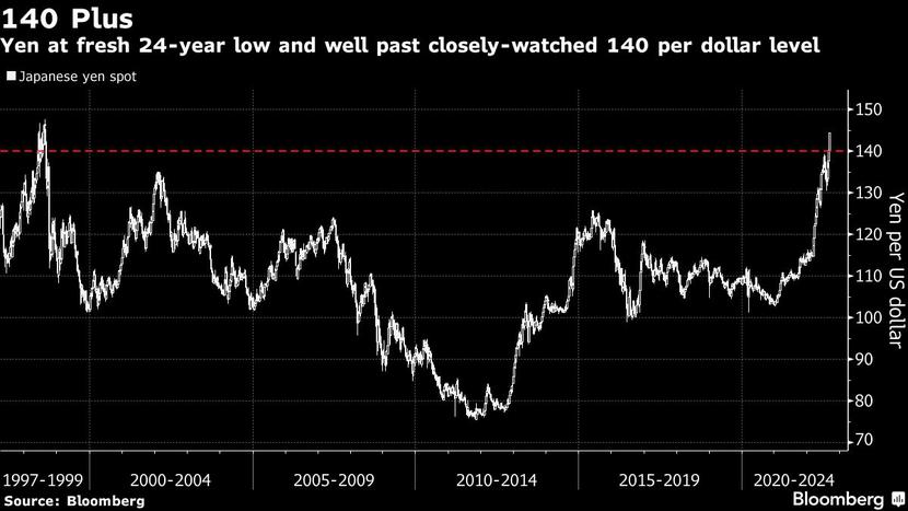 Podczas porannego środowego handlu, w trzecim dniu spadku w obecnej zniżkowej serii, jen stracił ponad 1 proc. dochodząc do poziomu 144,38 za amerykańskiego „zielonego”. A tymczasem jeszcze przed kilkoma dniami niemal niewyobrażalne było przebicie psychologicznego poziomu 140 jenów za dolara. Pokonanie progu 144 jest pierwszym takim przypadkiem od 1998 r.