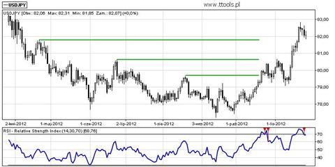 Mimo nakreślonego scenariuszu, można pokusić się o stwierdzenie, iż wszystkie wyżej opisane okoliczności zostały już odpowiednio zdyskontowane. Zwolennicy tej opinii zwracają uwagę na wysokie wartości RSI (14 – dniowe) wskazujące na wejście USD/JPY w obszar wykupienia (już czwarty raz w tym roku). Być może nastąpiła nadinterpretacja m. in. sytuacji politycznej oraz „wyrzucenie” stop lossów.