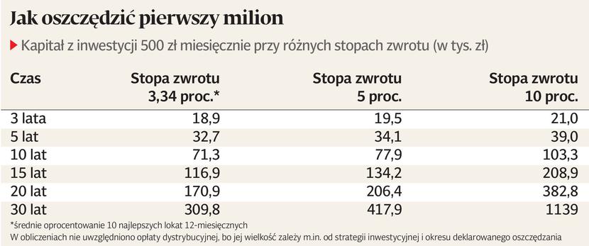 Trzydziestopięciolatek, który zacznie odkładać 500 zł miesięcznie w ramach któregoś z programów systematycznego oszczędzania i będzie zarabiał 5 proc. rocznie i płacił 3 proc. opłaty dystrybucyjnej, w chwili osiągnięcia wieku emerytalnego będzie miał do dyspozycji około 270 tys. zł. To pozwoli na podniesienie comiesięcznych dochodów o 1800 zł brutto przez 15 lat po zakończeniu pracy (przy założeniu, że roczna stopa zwrotu to 3 proc.). Dodatkowy dochód na emeryturze będzie 10 razy niższy, jeśli odkładać będziemy tylko 50 zł miesięcznie.