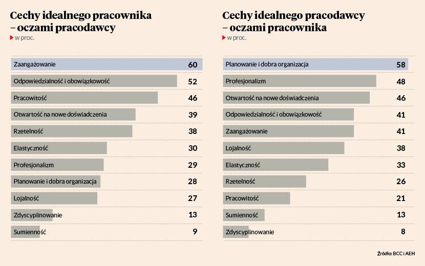 Badanie BCC i AEH prowadzono pod hasłem „Idealny pracodawca — idealny pracownik”. Wzięło w nim udział 483 zatrudnionych w różnych firmach i 99 przedsiębiorców. Przedstawili oni wzajemne oceny i oczekiwania. I tak według tych wyników np. komunikacja między współpracownikami i przełożonym oraz dobre stosunki w tych kontaktach mają obecnie mniejsze znaczenie dla pracowników niż w 2018 r. Zatrudnieni nie przywiązują już też tak dużej wagi jak wtedy do takich postaw i cech szefów, jak elastyczność (spadek odsetka głosów z 59 proc. do 33 proc.), lojalność czy współpraca.