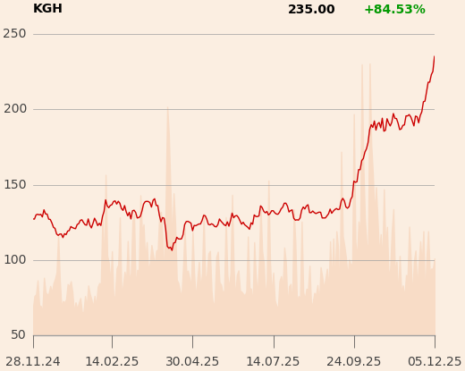 Kurs KGHM na zamknięciu sesji 4 grudnia wyniósł 225,1 zł. W miesiąc urósł o 20,4 proc. (WIG w tym czasie spadł o 1,33 proc.), a stopa zwrotu za 12 miesięcy to 72,6 proc., dwa razywięcej niż dla WIG-u.