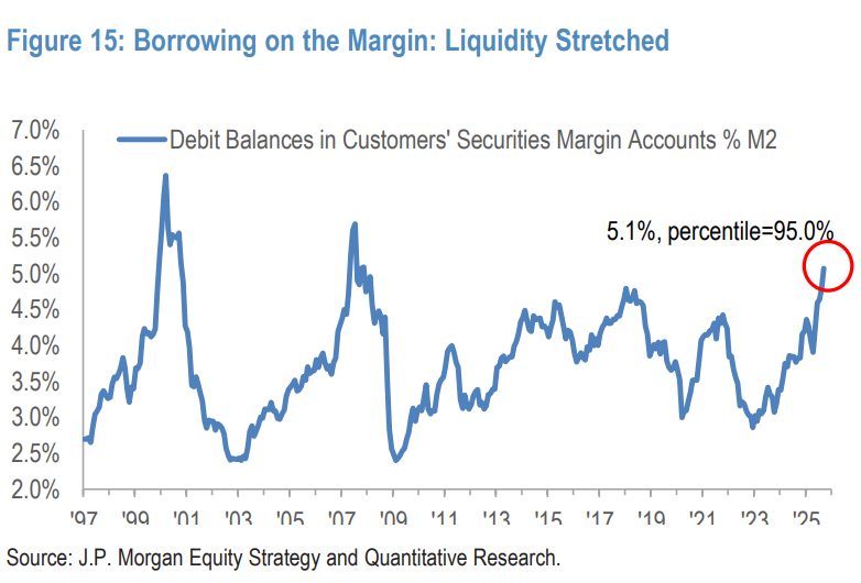 Gdzieś pomiędzy optymistycznymi prognozami dla Wall Street w raporcie JPM znaleźć też można kilka wykresów dotyczących czynników ryzyka. JPM porównuje wielkość długu na rachunkach maklerskich z podażą pieniądza M2. Wg wyliczeń JPM dług doszedł do 5,1 proc. podaży pieniądza, co oznacza, że jest już w 95-tym percentylu historycznego zbioru wartości. Wysoko, choć nie aż tak skrajnie, jak na szczytach w 2007 i 2000.
