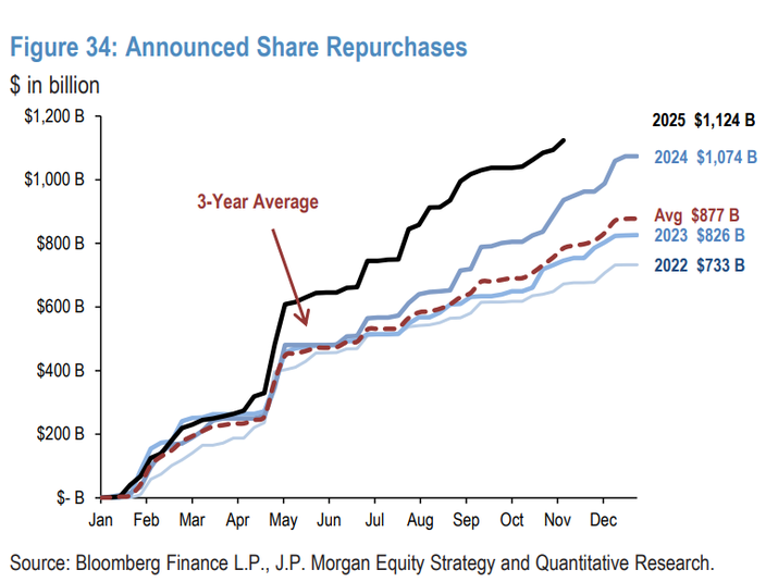 Oznaką siły amerykańskich korporacji są, zdaniem JPM, przyspieszające skupy akcji własnych (buybacks), które oznaczają dodatkowy zastrzyk popytu na rynku oraz - przy okazji - prowadzą do szybszego wzrostu zysków na akcję (za sprawą zmniejszania liczby akcji). Bank zwraca uwagę, że już w tym roku kwota zapowiedzianych skupów osiąga rekordowe rozmiary (ponad 1,1 bln USD).