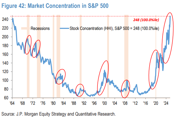 Z wyliczeń JPM wynika, że tzw. wskaźnik koncentracji (HHI) wspiął się w przypadku indeksu S&P 500 na poziom niewidziany od co najmniej sześciu dekad. Tak silna koncentracja ma swoje zalety (wąska grupa technologicznych liderów ciągnie indeks w górę), ale też oznacza, że S&P 500 przestał być silnie zdywersyfikowanym benchmarkiem, za jaki można go było uznać jeszcze kilkanaście lat temu.