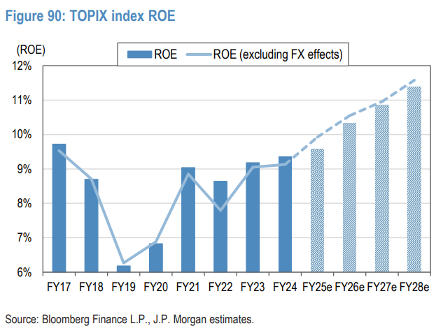 Wśród innych wykresów JPM na temat rynków globalnych szczególną uwagę zwracać może ten pokazujący trwający już i mający przyspieszyć wzrost rentowności japońskich spółek. W przyszłym roku wskaźnik rentowności kapitałów własnych firm z indeksu TOPIX ma wreszcie, po raz pierwszy od lat, wejść na poziom dwucyfrowy. Ma to być zdaniem JPM efekt normalizacji sytuacji w japońskiej gospodarce, która wychodzi stopniowo z ery deflacji i ultra niskich stóp procentowych.