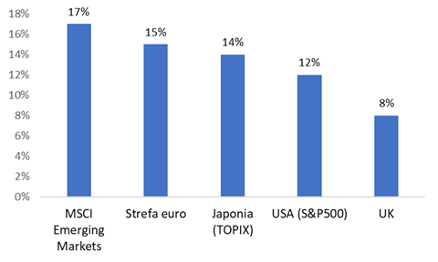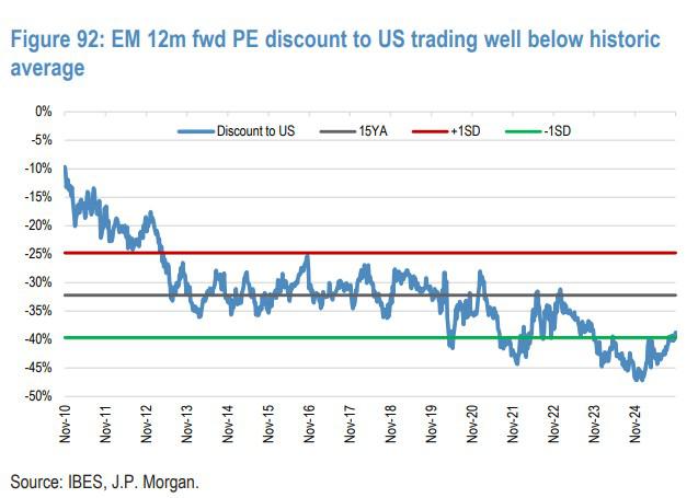 Powody, dla których JP Morgan - zgodnie z ogólnym konsensem - faworyzuje rynki wschodzące są zasadniczo dwa. Po pierwsze, EPS (zysk na akcję) ma wg prognoz urosnąć w 2026 w przypadku indeksu MSCI Emerging Markets o 17,5 proc. (wobec 11 proc. w br.). Po drugie, wskaźnik ceny do prognozowanych zysków jest na EM średnio niemal 40 proc. poniżej tego w USA, co oznacza nadal głębokie z historycznego punktu widzenia dyskonto względem amerykańskich akcji.