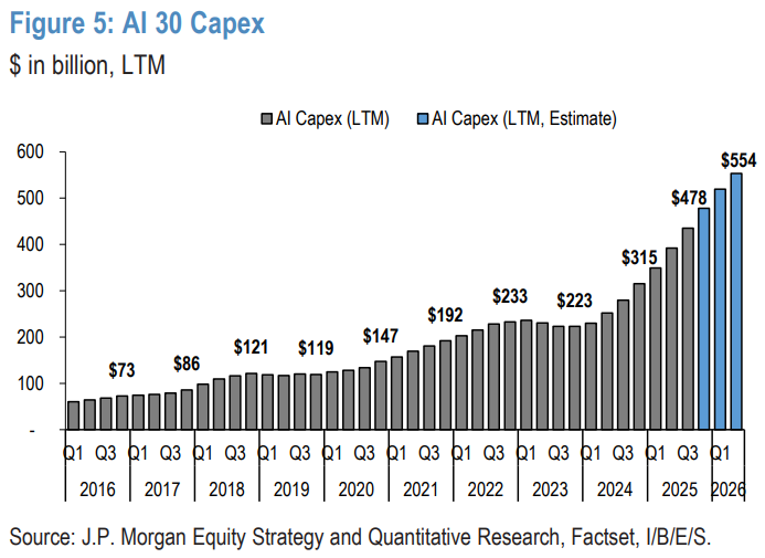 Relatywnie korzystne prognozy dla innych rynków nie oznaczają, że JPM jest negatywnie nastawiony do akcji z USA. Przyznaje co prawda, że wyceny na Wall Street są wysokie, ale jego zdaniem są adekwatne do prognozowanego przyspieszonego wzrostu zysków spółek wdrażających narzędzia AI. JPM nie obawia się też ewentualnych negatywnych konsekwencji coraz szybszego wzrostu Capex (nakładów inwestycyjnych). Zdaniem banku te dodatkowe inwestycje mają przełożyć się na dodatkowe zyski, a wzrost nakładów będzie sprzyjał podtrzymaniu koniunktury gospodarczej.