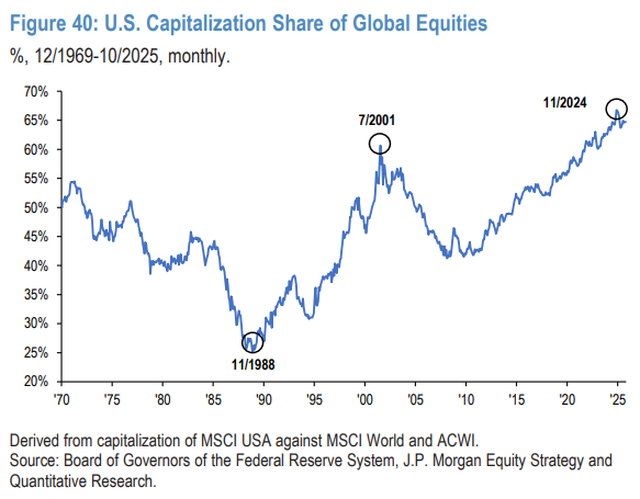 Argumentem za dywersyfikacją portfela w kierunku globalnych akcji (z punktu widzenia amerykańskiego inwestora) może być to, że na skutek hossy związanej z boomem AI kapitalizacja rynku w USA osiągnęła bezprecedensowe rozmiary na tle całego giełdowego świata. A przecież nie zawsze tak było. Udział amerykańskich akcji w globalnym rynku potrafił niekiedy przez lata się obniżać.