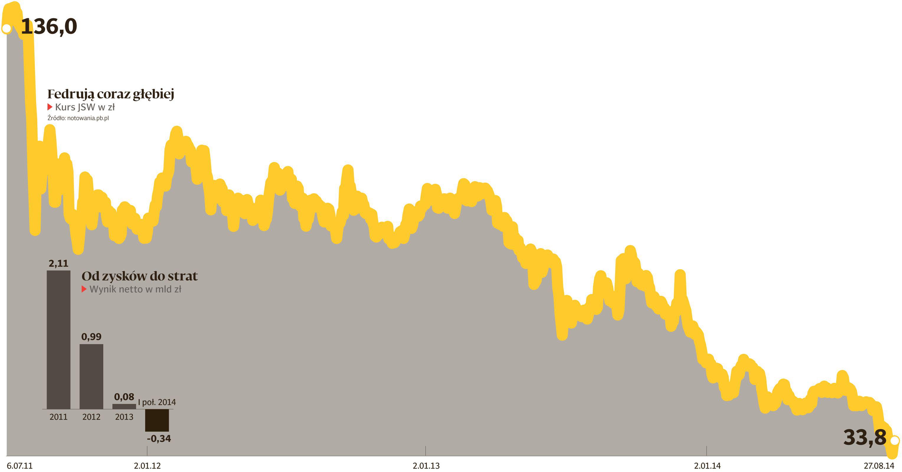 Akcje JSW zadebiutowały na giełdzie w lipcu 2011 r. Kilkuzłotowy zysk zdążyli na nich zrealizować tylko nieliczni spośród 168 tys. inwestorów indywidualnych, którzy płacili za akcję po 136 zł. Już na początku sierpnia 2011 r. wycena papierów spadła do niespełna 102 zł. Dziś nie sięga nawet jednej trzeciej tej kwoty. Podobnie stało się z dywidendą. W 2012 r. spółka wypłaciła 5,38 zł za akcję, rok później 2,52 zł. W 2014 nic, bo ledwie trzy lata obecności spółki na giełdzie wystarczyły, by zyski wyparowały. To również stoi w sprzeczności z deklaracjami prezesa z czasu oferty.
