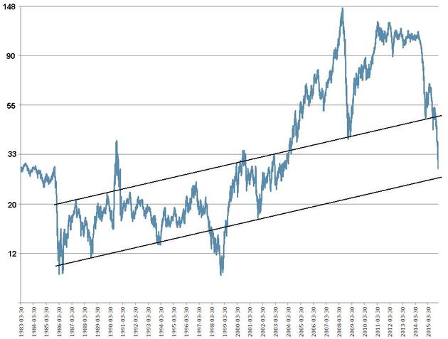 To argument, by za długoterminowe ramy notowań ropy uznać sięgający 30 lat wstecz lekko wzrostowy kanał o nachyleniu 2,8 proc. rocznie. To nachylenie niemal dokładnie równe dynamice cen w amerykańskiej gospodarce za taki sam okres. Właściwa wycena ropy, zależna od aktualnej sytuacji na rynku, będzie w długim terminie mieścić się w przedziale 26-49 USD według obecnej wartości dolara, wynika z położenia formacji. To oznacza nic innego jak to, że ze sporym prawdopodobieństwem można stwierdzić, że przecena ropy nie sięgnie głębiej niż okolice 26 USD za baryłkę.