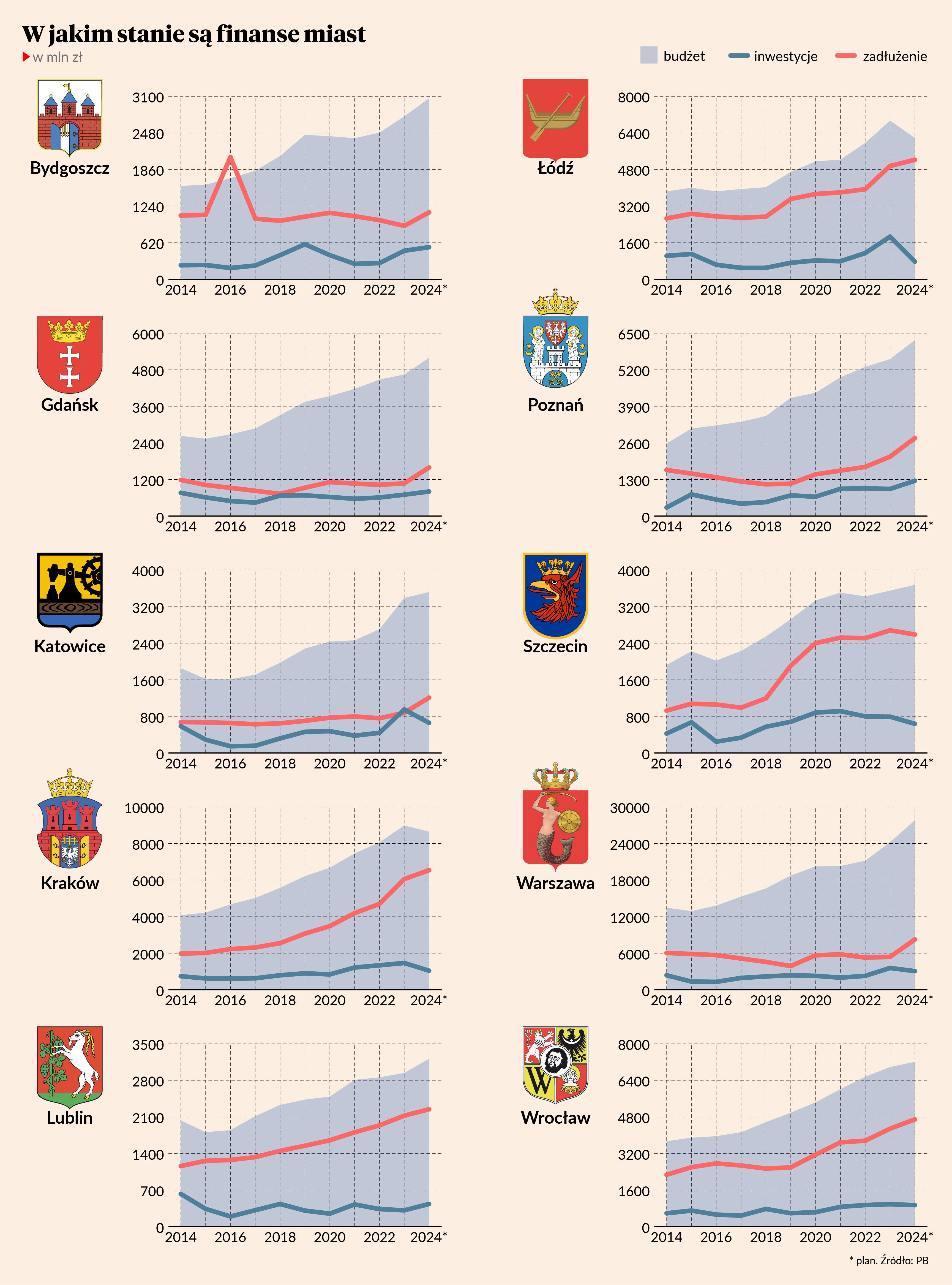 Niektóre miasta zmniejszyły na ten rok budżety. Spośród dziesiątki, której budżety analizuje PB, mniejsze od ubiegłorocznych wydatki planują: Kraków i Łódź. Więcej jest miast, które zamierzają wydać mniej na inwestycje: to Katowice, Kraków, Łódź, Szczecin, Warszawa i Wrocław.