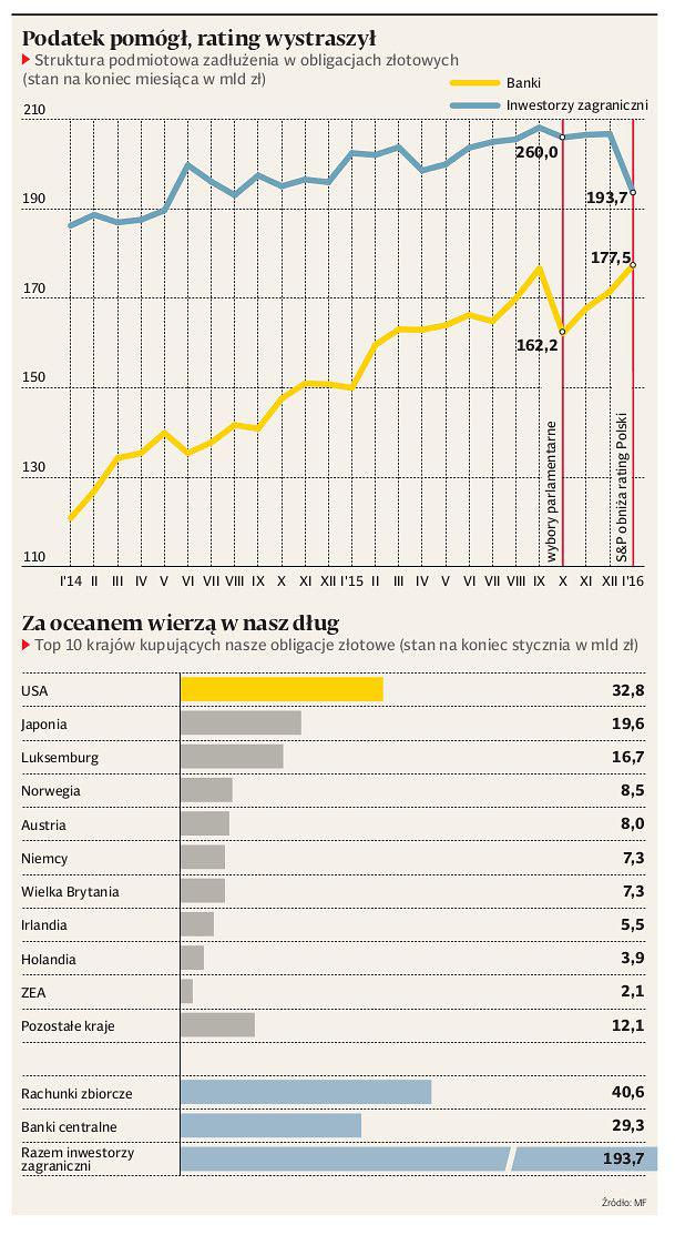 — Mieliśmy kumulację — obok zaskakującej decyzji S&P — kilku negatywnych czynników. Nie sądzę jednak, żeby to był jakiś trend odpływu kapitału — mówi Mateusz Sutowicz, analityk rynków finansowych w Banku Millennium. Także MF uważa, że temat naszego ratingu jest już ostatecznie zamknięty, a dodatkowo ostatnie spotkania z inwestorami w USA i Londynie pomogły rozwiać wątpliwości co do przyszłości polityki gospodarczej. — Cały czas widzimy bardzo duży popyt na nasz dług, a rentowności obligacji długoterminowych są na poziomie sprzed cięcia ratingu. To zaś świadczy o tym, że nasza wiarygodność kredytowa jest stabilna — podkreśla wiceminister finansów.