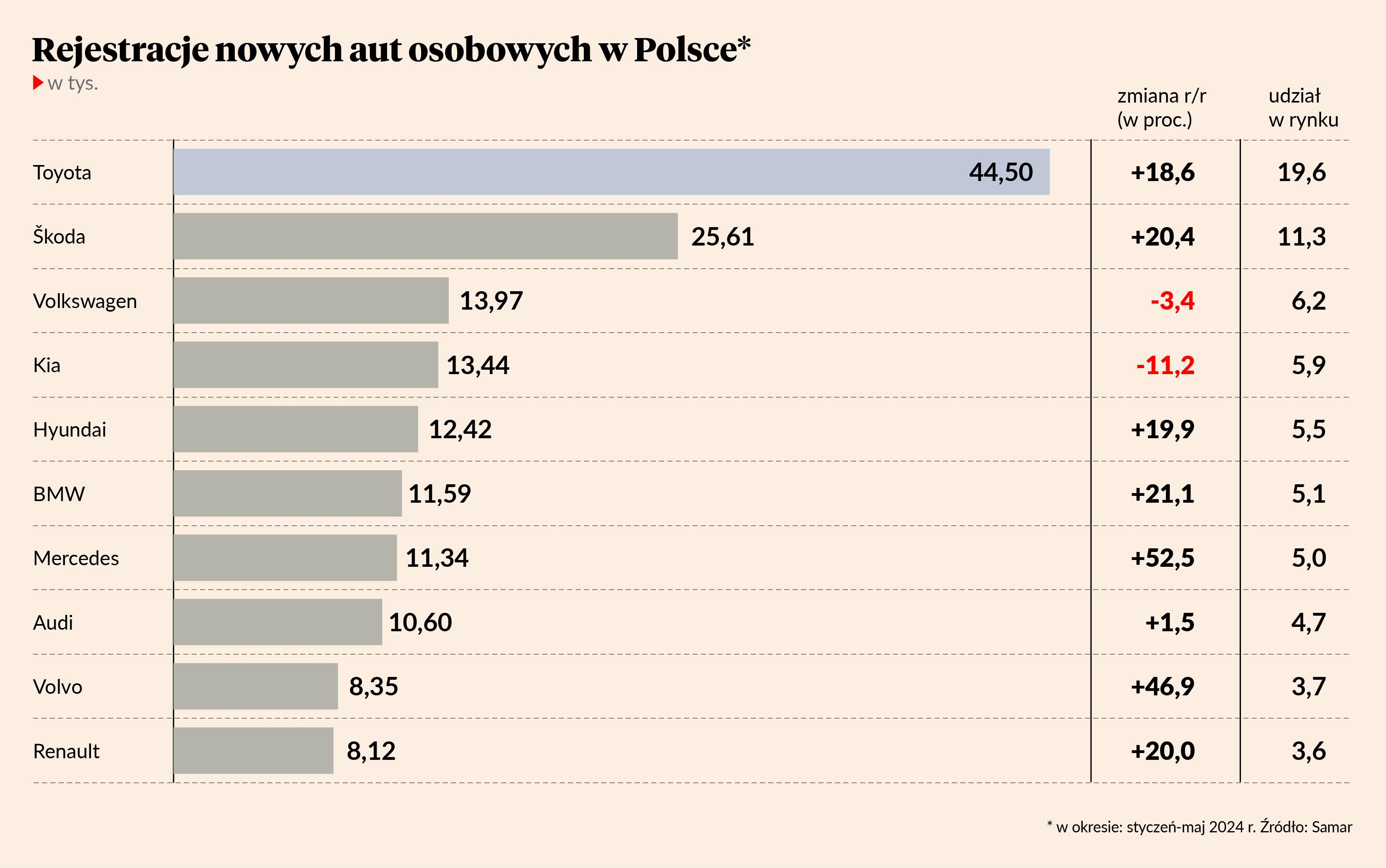 Na podium niewiele się zmieniło. Karty rozdaje Toyota. Między styczniem a końcem maja zarejestrowano 44,5 tys. aut osobowych tej marki (+18,6 proc.), co daje jej nie tylko prawie 20-procentowy udział w naszym rynku, ale też kosmiczną przewagę nad resztą stawki. Druga w zestawieniu Skoda zarejestrowała nieco ponad 25,6 tys. (+20,4 proc.), zgarniając prawie 11,3 proc. rynku. Trzecie miejsce należy do Volkswagena — prawie 14 tys. rejestracji (-3,4 proc.), który najpewniej czuje na plecach oddech marki Kia.
