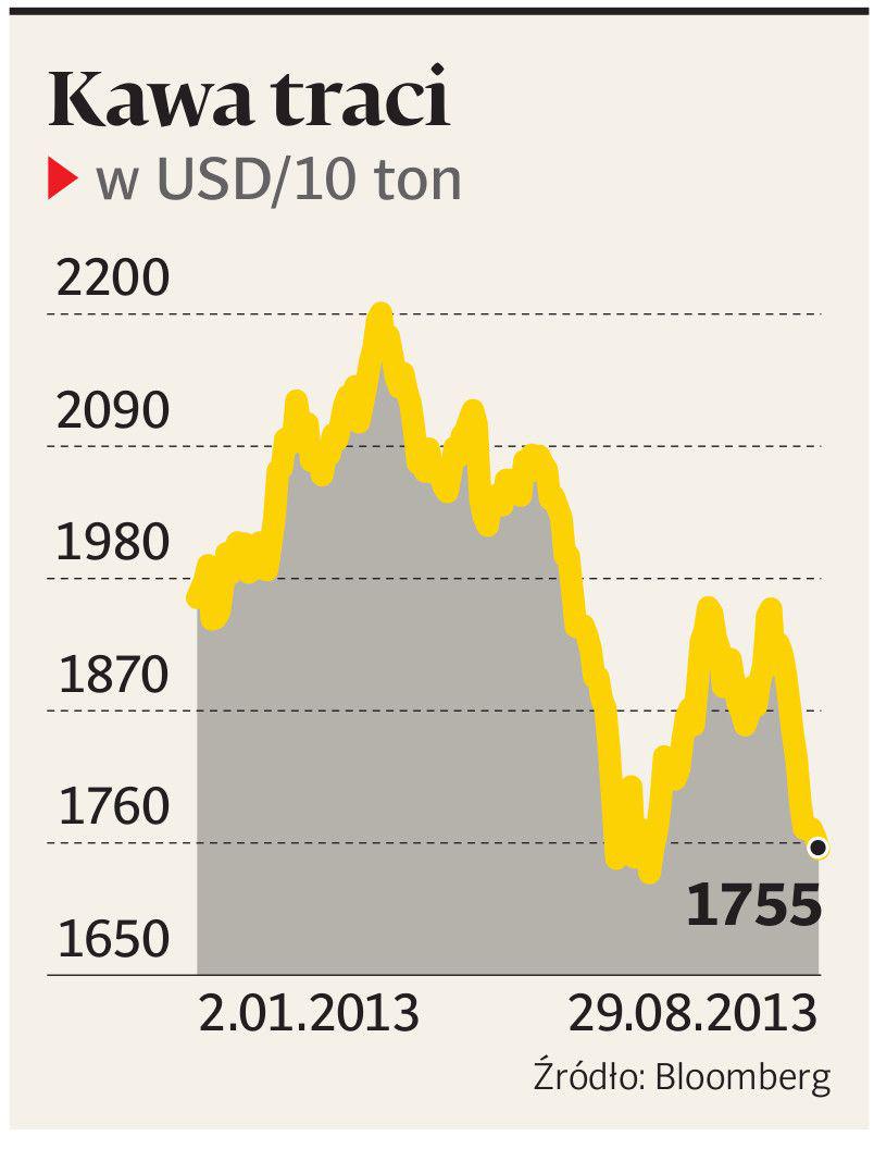 Wszystkiemu winne ulewne deszcze i powodzie na indonezyjskich terenach upraw, które uniemożliwiają zbiór i suszenie ziaren. Holenderska firma Nedcoffee, która skupuje robustę od Indonezji, donosi o mniejszych o 16 proc. dostawach surowca niż rok temu. Zapasy na nowojorskiej NYSE Liffe również są mniejsze od zeszłorocznych o 34 proc. Tak niskie były 13 lat temu. Bloomberg prognozuje więc, że kontrakty terminowe na ziarno mogą wzrosnąć o 13 proc., do 2 tys. USD za tonę. Dzisiaj tona kosztuje 1760 USD. Do tej pory przewidywano kolejne przesycanie rynku tą kawą. Wartość kontraktów na NYSE Liffe spadła w tym roku o 17,7 proc. W ciągu ostatnich 12 miesięcy o 29 proc. Teraz producenci liczą na przyspieszenie zbiorów od innego światowego dostawcy robusty — Wietnamu. Tam pogoda na razie nie krzyżuje planów plantatorom i ci spodziewają się dostarczyć nawet 13 proc. więcej ziarna niż rok temu. Przewidywalna wielkość zbioru pod koniec 2013 r. wynosi 1,7 mln ton. Robusta jest ziarnem mniej cenionym niż powszechniej spotykana arabica i wykorzystuje się ją jako wypełniacz przy produkcji kawy mielonej. Jest również głównym składnikiem do produkcji kawy rozpuszczalnej. Właśnie robusta odpowiada za większą, charakterystyczną dla kawy parzonej piankę.