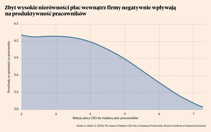 Refleksja nie powinna dotyczyć jedynie socjologów, ale także ekonomistów. Ograniczanie dysproporcji płacowej między pracownikami niższego szczebla a menedżerami i prezesami ma bowiem nie tylko sens moralny i społeczny, ale również biznesowy. Grupa europejskich ekonomistów przeanalizowała dane finansowe 1403 największych amerykańskich spółek w latach 2018-22 i doszła do następującego wniosku: istnieje wklęsła zależność między względnym wynagrodzeniem CEO a produktywnością pracowników. Punkt krytyczny występuje, gdy wynagrodzenie szefa firmy przekracza 40-krotność mediany płacy pracowników — powyżej tego progu relatywny wzrost płacy prezesów obniża wydajność firmy, co pokazuje wykres. Porównując ten próg z wcześniej opisanymi nierównościami płac w krajach rozwiniętych, można stwierdzić, że są one za wysokie.