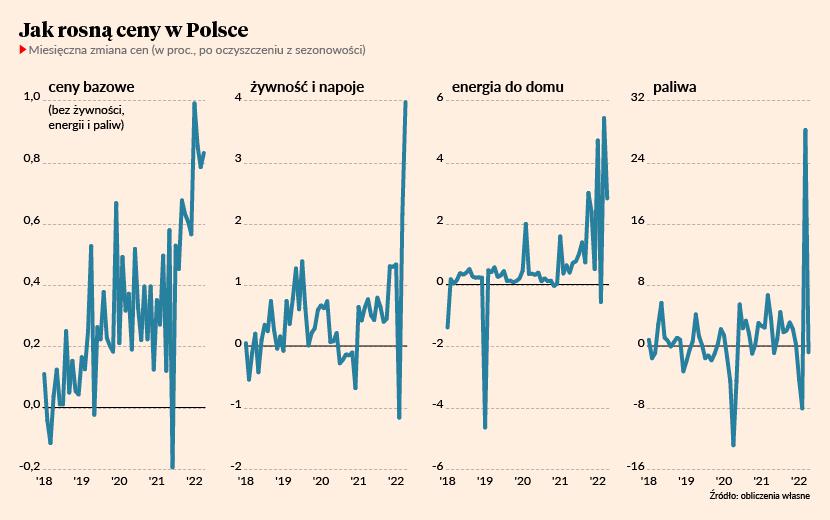 Wiele natomiast wskazuje, że największy impet podwyżek cen możemy mieć za sobą. Ceny bazowe, czyli nie uwzględniające cen żywności i energii, rosną bardzo szybko (0,8 proc. miesiąc do miesiąca), dużo szybciej niż powinny, ale już nieco wolniej niż na początku roku. Ceny energii dla gospodarstw domowych odnotowały już największe skoki. Ceny żywności wzrosły tak gwałtownie w kwietniu, że trudno sobie wyobrazić powtórkę z rozrywki. Ceny paliw skokowo wzrosły zaś w marcu i musiałoby dojść do zatrzymania dostaw ropy z Rosji, by to się powtórzyło.