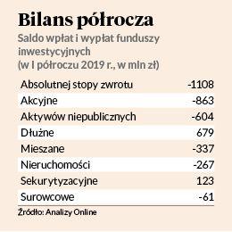 Z funduszy akcji klienci wycofali w czerwcu 65 mln zł, przy czym ujemne saldo dotyczyło znów funduszy uniwersalnych (są pod kreską w każdym z miesięcy tego roku). Nieznacznie na plusie były fundusze akcji małych i średnich spółek (+6 mln zł), które dzięki zwyżkom cen akcji (sWIG80 wzrósł od początku roku o 12 proc., a mWIG40 o ponad 5 proc.) zanotowały dodatni bilans w każdym z miesięcy tego roku z wyjątkiem maja. 25 mln zł netto odpłynęło w czerwcu z funduszy mieszanych, przy czym utrzymała się tendencja, zgodnie z którą klienci wycofują pieniądze z rozwiązań skupionych na polskim rynku (-55 mln zł w czerwcu i -931 mln zł netto od początku roku), by część przenieść na rynki zagraniczne (+30 mln zł w czerwcu i prawie 600 mln zł netto w pierwszym półroczu). Jak podają Analizy Online, na 33 monitorowane TFI w 11 bilans sprzedaży był w czerwcu dodatni. Najwięcej pieniędzy (ponad 0,6 mld zł) zdobyła Ipopema (głównie do rozwiązań niedetalicznych), a po ponad 100 mln zł netto zdobyły Santander TFI, TFI PZU i BNP Paribas TFI. Największe odpływy dotknęły natomiast PKO TFI.