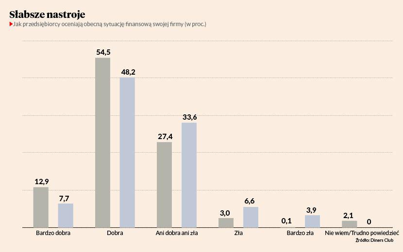 — Mniej optymistyczne prognozy mogą wynikać z kilku powodów. Pierwszym jest rekordowo niskie bezrobocie, które wymusza na przedsiębiorcach podniesienie płac. Firmy nie mogą już konkurować kosztem pracy. MŚP źle wróżą również rosnące ceny paliw oraz energii elektrycznej. Nie bez znaczenia są także prognozy o ogólnym pogorszeniu koniunktury na świecie, która pośrednio wpłynie na sytuację gospodarczą w naszym kraju — podsumowuje Paweł Kałudow, dyrektor działu sprzedaży i marketingu w Diners Club Polska.