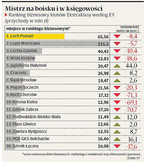 W biznesowej tabeli EY — podobnie jak w tabeli boiskowej — triumfował Lech Poznań, mimo że jego przychody były prawie dwa razy mniejsze niż warszawskiej Legii. Lider zmienił się po raz pierwszy od trzech lat. Lech miał lepsze od stołecznego rywala wskaźniki płynności, obciążenia majątku zobowiązaniami czy dywersyfikacji przychodów. Jego mecze przyciągały też na trybuny przeciętnie najwięcej kibiców w kraju. Przychody wszystkich klubów Ekstraklasy w 2014 r. wyniosły 454 mln zł. Największą pozycję stanowiły wpływy ze sponsoringu i reklamy — to aż 135 mln zł. Problem w tym, że przychody z tego źródła nie rosną.