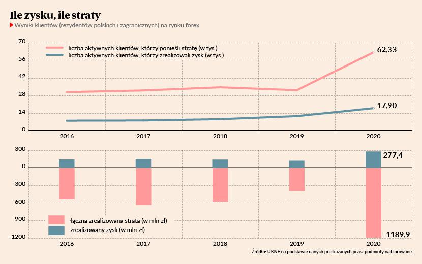 “Dane pokazują, że większość aktywnych klientów (77,7 proc.) poniosła stratę na transakcjach na rynku forex w 2020 r. Łączna absolutna wartość strat poniesionych przez klientów stanowiła ponad czterokrotność łącznej absolutnej wartości osiągniętych zysków. Średni wynik przypadający na jednego klienta aktywnego w 2020 r. pogorszył się w stosunku do 2019 r. – stanowił dwukrotnie większą stratę” - głosi raport UKNF.