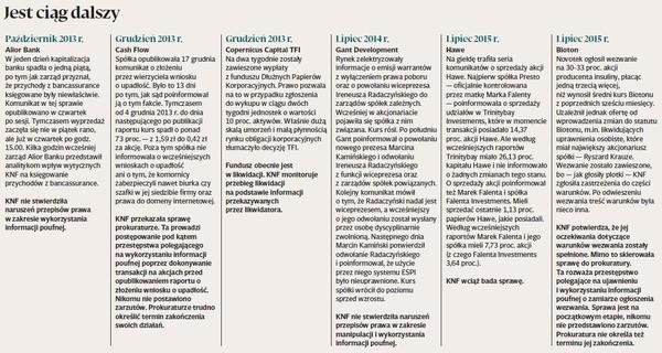 Z czasem większość spraw cichnie, odchodzi w zapomnienie, a inwestorzy i media żyją już innymi kwestiami. Postanowiliśmy więc przypomnieć kilka przypadków, które wzbudziły niesmak małych akcjonariuszy, a którymi urzędnicy KNF zajmowali się co najmniej pół roku temu. W jednej trzeciej przypadków UKNF nie stwierdził naruszenia prawa w wyniku wykorzystania informacji poufnej. Nad jedną trzecią podobnych przypadków wciąż się zastanawia. W przypadku funduszu inwestycyjnego, który zawiesił wypłaty, monitoruje po prostu proces jego likwidacji. W dwóch z dziewięciu przypadków urząd skierował sprawę do prokuratury. Ciekawy jest pod tym względem przypadek wezwania na Bioton z 2015 r., gdzie wzywający spełnił oczekiwania KNF, a mimo to KNF dopatrzyła się symptomów przestępstwa. Co o tym myśli prokuratura — a zwłaszcza sąd — dowiemy się jednak nieszybko. W prokuraturze poinformowano nas, że sprawa jest na początkowym etapie, nikomu nie przedstawiono zarzutów, a terminu zakończenia postępowania nie da się jeszcze określić. Identycznie jest ze sprawą upadłości Cash Flow z… 2013 r.