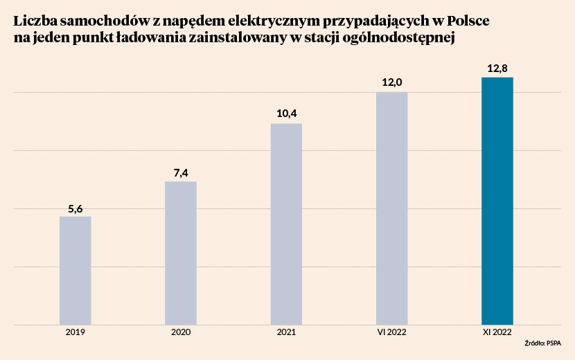 Z najnowszego raportu Polskiego Stowarzyszenia Paliw Alternatywnych (PSPA) „Polish EV Outlook 2022” pod koniec 2019 r. liczba samochodów z napędem elektrycznym przypadających na jeden punkt ładowania wynosiła 5,6. W 2020 r. ta proporcja wzrosła do 7,4, w 2021 r. do 10,4, zaś w połowie 2022 r. – do 12. W listopadzie wynosiła już 12,8.